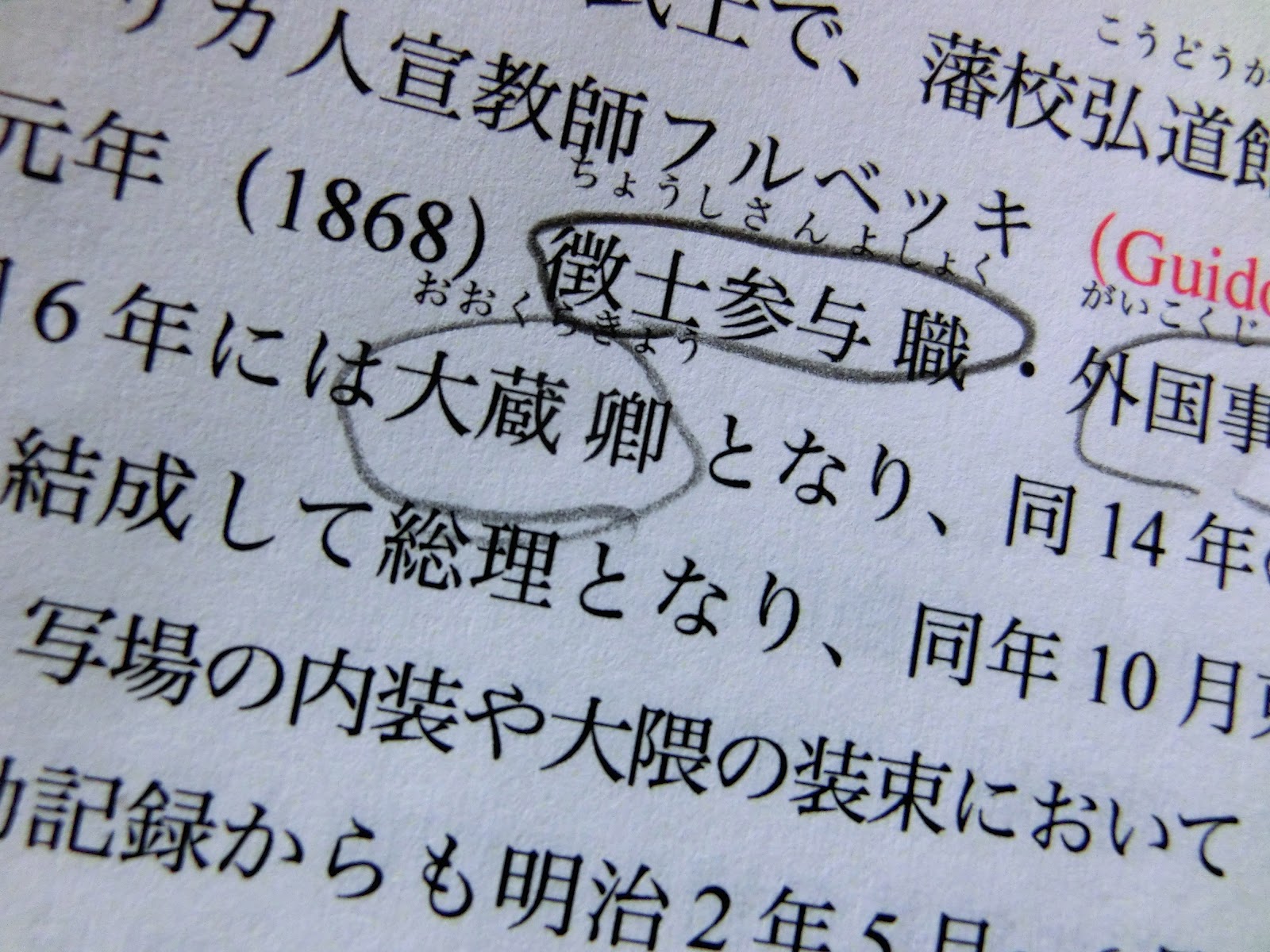 今日の翻訳では、「北陸道鎮撫総督参謀」「長州藩蔵元中元」「旗本小普請組」「徴士参与職」などのところで、むむむっ〜!とキーボードを打つ手が止まってしまったのでした。