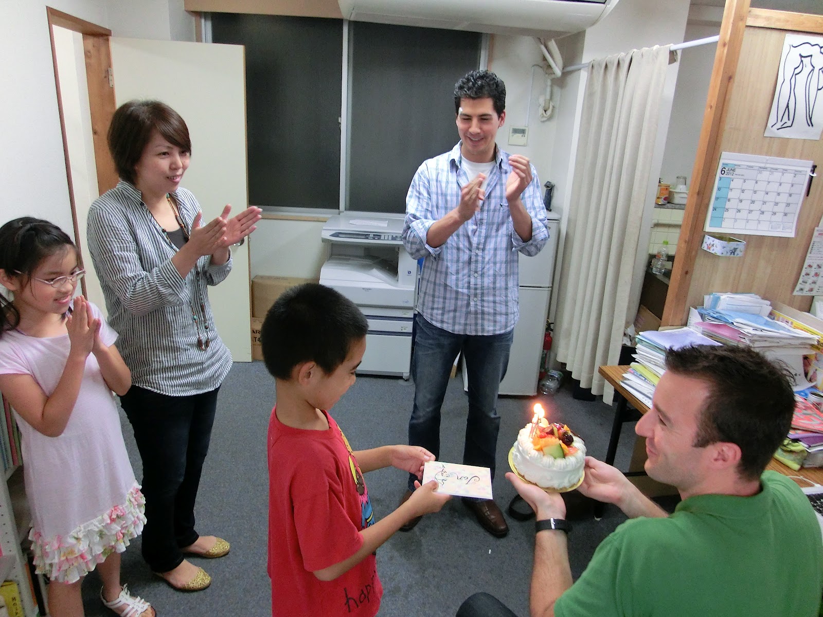 おとといは5月からエスタミネーのスタッフに加わったIanの誕生日でした。ちょうど住吉教室に居合わせた生徒さんたちとスタッフでお祝いしました。