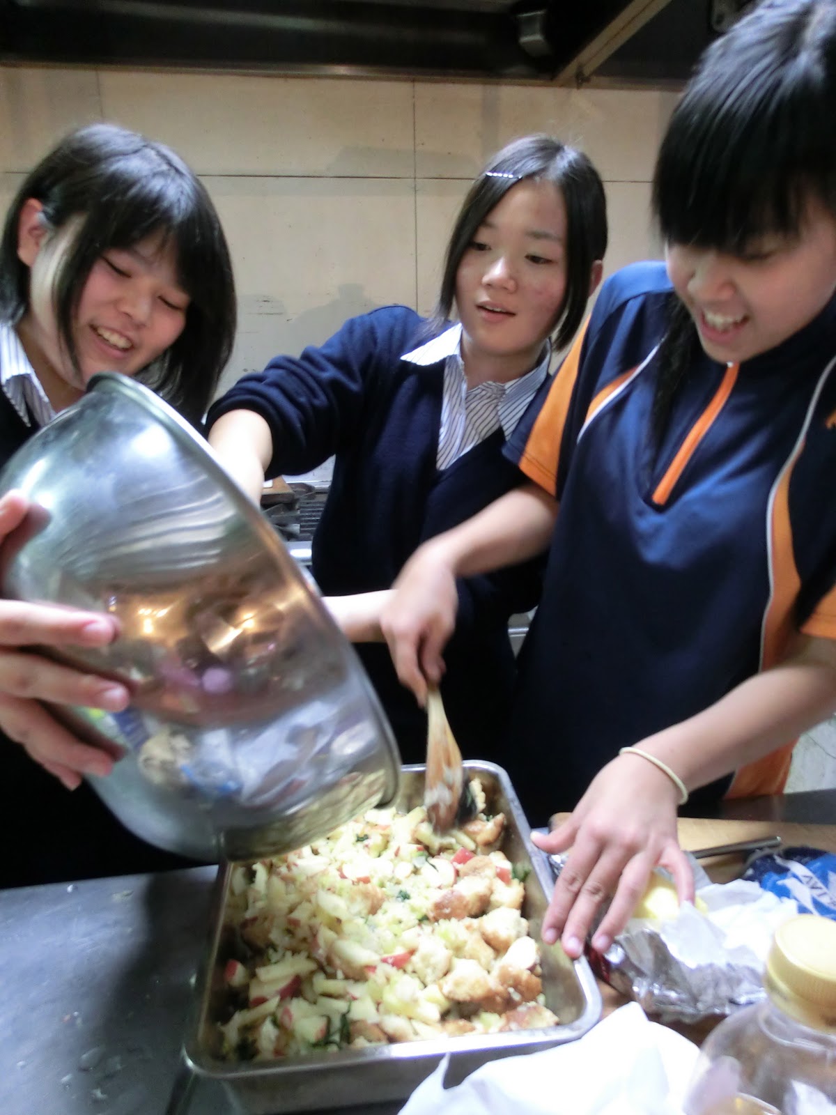 きのうは高校生のクラスで英語でクッキングをやりました。みんないつもより30分早くやって来ました。ThanksgivingやChristmasのときにアメリカではturkey、つまり七面鳥を焼きます。日本ではあまりなじみがない七面鳥ですが、今回は近所のお肉屋さんでも手に入るホールチキンでやってみました。私はいつもエスタミネー英語教室住吉校からすぐの住吉商店街の中の「肉のわたなべ」で買います。